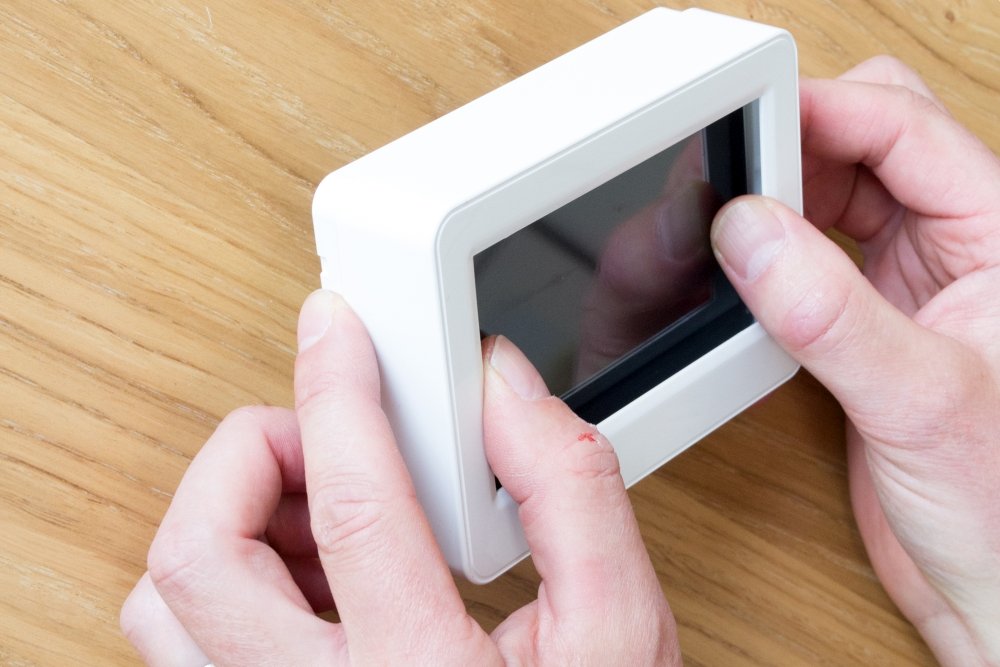 1. Tryck isär ramen från displayen genom att hålla fast ramen i kanterna och tryck lätt på displayen.