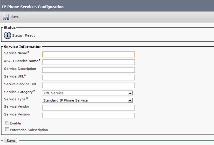 Enable: This check box allows you to enable or disable the service without removing the configuration from Cisco Unified Communications Manager Administration (and without removing the service from the database). Unchecking the check box removes the service from the phone configuration file and the phone