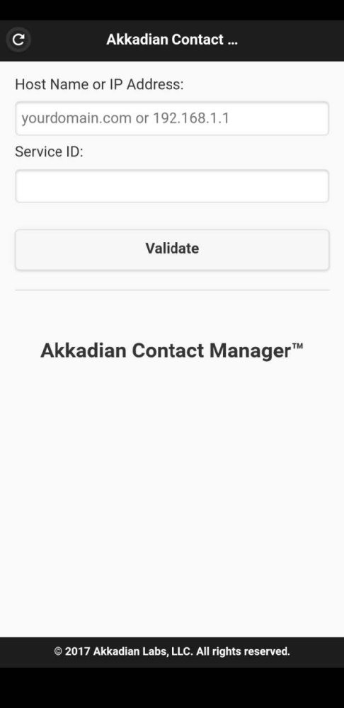 From the Mobile App ensure you have connectivity to the Akkadian Contact Manager. Enter the hostname or IP Address of the Akkadian Contact Manager and Service ID (optional).
