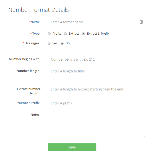 Number begins with: allows Administrators to set a series of numbers, which must be matched in order for a Number Format to apply.