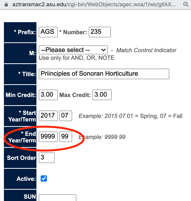 - If courses are no longer available, end date them by clicking on the “Edit” tab immediately preceding the course in the AGEC Database and editing the “End Year/Term” field. Do not delete them. Refresh the screen and confirm that the coursework no longer shows in the AGEC.