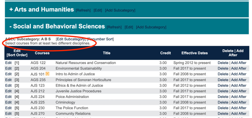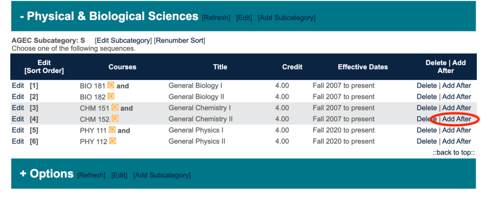 - If new courses have been added to your AGEC, please include them in the appropriate subcategories. Locate the space alphabetically where the prefix of the new course should be inserted. Click on the “Add After” tab on the line of the preceding course. Complete the required fields to add the new course.