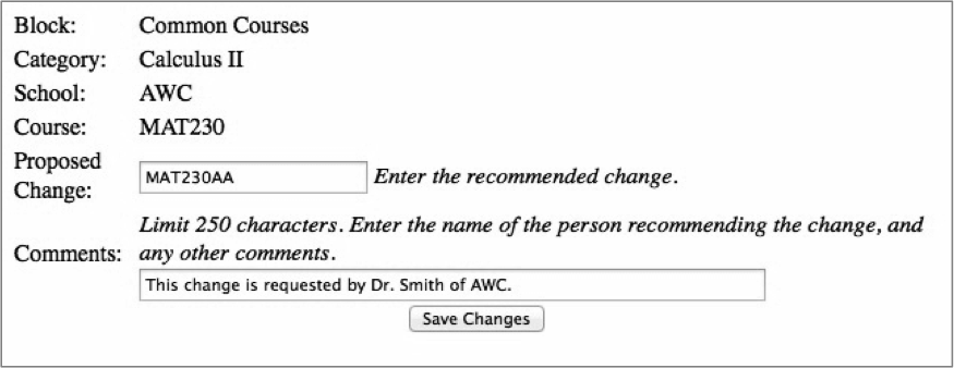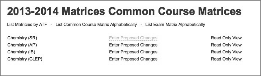During an ATF Meeting, you may wish to enter the proposed matrix changes. If you prefer to wait until after the meeting to enter in proposed changes to a matrix, be sure to print all of the Common Course and Exam Matrices and have them on hand during the meeting for easy note taking.