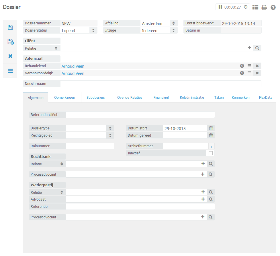 Im Hauptbereich des Akten-Bildschirmbereichs können Rechtsanwälte und Kontakte eingegeben werden. Hier können Sie Ihre Kontakte eingeben (ein Individuum, ein Unternehmen oder eine private Person). Ebenso können Sie hier einen zugeordneten und verantwortlichen Rechtsanwalt hinzufügen. Letzterer sollte immer ein Mitarbeiter Ihrer Kanzlei sein.