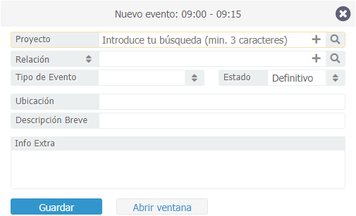 Esta ventana se utilizará para introducir un nuevo evento de calendario. El proyecto y/o relación pueden vincularse a un evento de calendario. Al hacerlo, el evento de calendario será visible en el histórico de proyecto y relación. Y si es usuario de BaseNet le aparecerá el evento en su calendario también.