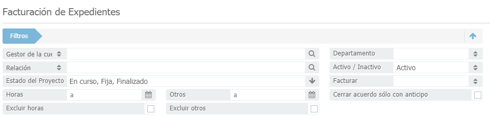 En la pantalla de facturación de expedientes solo se mostrarán aquellas minutas que estén pendientes de crear, procesar y enviar. Es importante que sus expedientes tengan el estado adecuado para que se puedan encontrar fácilmente en los filtros por defecto. Preste especial atención a qué estados de expediente va a buscar en esta pantalla.
