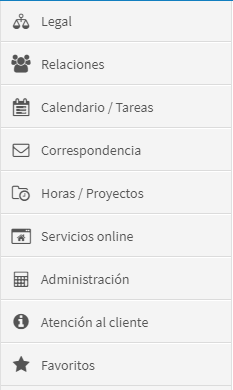 - Legal: aquí podrá encontrar todo lo relacionado con los expedientes, administración de funciones, facturación de expedientes, turno de oficio…