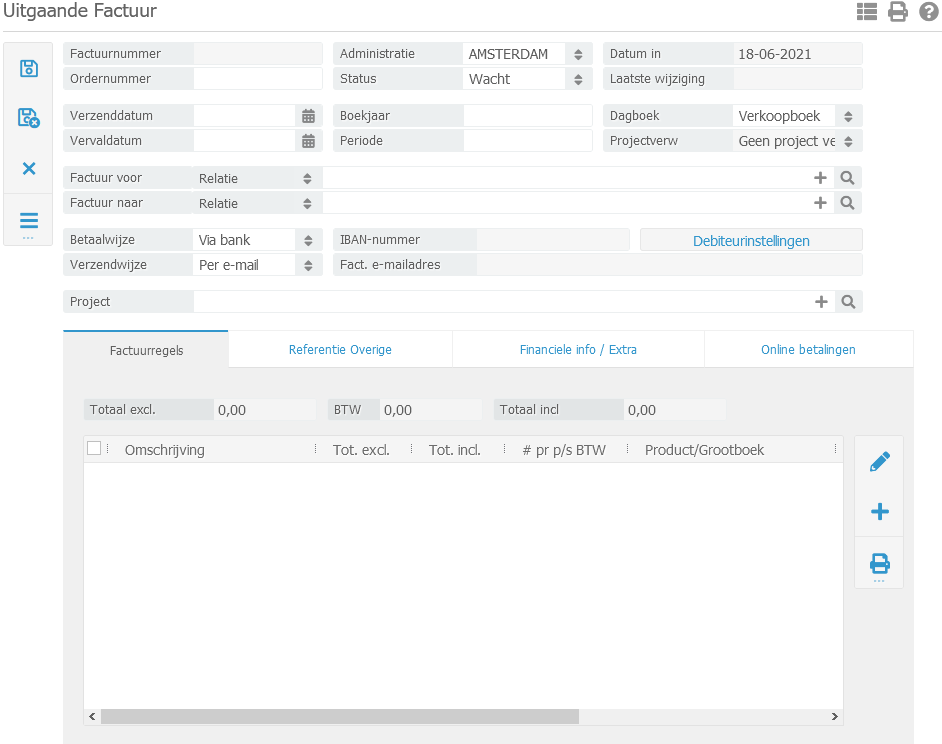 - Dit scherm wordt gebruikt voor zowel de debiteuren als de crediteuren. Voor de uitgaande factuur kunt u de volgende velden gebruiken: