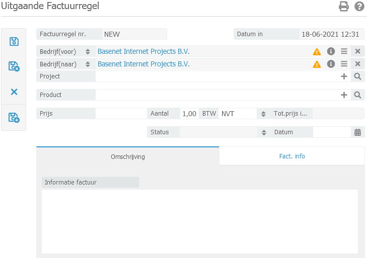 - Bedrijf(voor), Bedrijf(naar) en Project: Deze velden worden automatisch ingevuld, indien deze ingevuld staan in de uitgaande factuur.