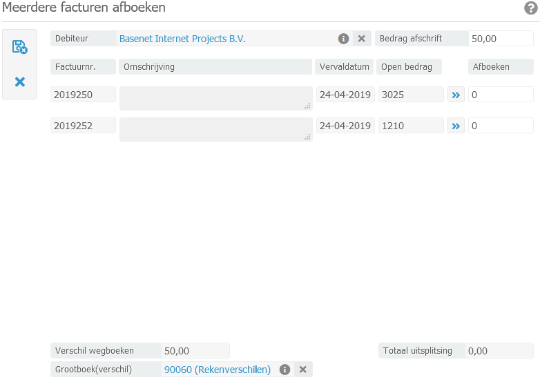 - Situatie D: De afschrift regel heeft betrekking op meerdere facturen, welke in BaseNet zijn aangemaakt en is van dezelfde debiteur of van meerdere debiteuren;