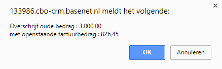 Factuur debiteur: Voer het factuurnummer van één van de openstaande uitgaande facturen in, waarop de verzamelbetaling betrekking heeft. Indien het factuurbedrag lager is dan het het bedrag van de verzamelbetaling wordt de volgende melding getoond (bedragen dienen als voorbeeld):