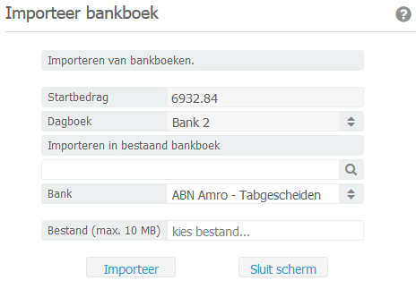 - Bank: Selecteer het bank formaat. Hier wordt standaard de ABN Amro ingevoerd, maar alleen bestanden van het formaat MT940 IBAN of CAMT.053 kunnen geïmporteerd worden.