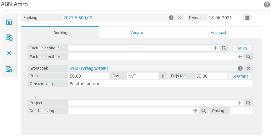 - Bedrag afschrift: Hier wordt automatisch het bedrag van de geïmporteerde regel geladen.