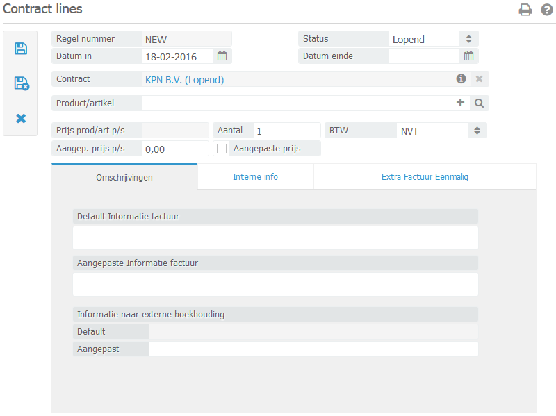 om contractregels aan het contract toe te voegen. Het volgende invoerscherm zal in een nieuw venster worden geopend: