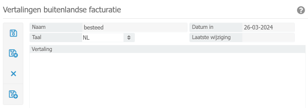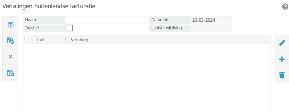 Indien u gebruik maakt van buitenlandse facturatie kunt u in dit scherm de vertalingen voor de uitgaande declaraties beheren. Deze vertalingen zullen vervolgens kunnen worden opgehaald in de factuurtemplates alsook in de templates voor de herinneringen indien de betreffende templatecodes worden gebruikt..