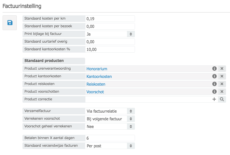 !Het is van belang om de gekoppelde producten NIET te wijzigen. Dit heeft namelijk directe gevolgen voor het doorboeken van uw facturen. De velden ‘Product correctie’ en ‘Verzamelfactuur’ zijn enkel beschikbaar indien u gebruik maakt van de accountancy module.