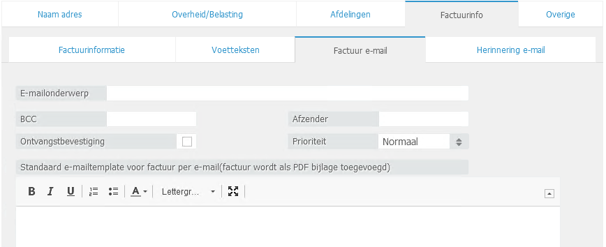 - BCC: Indien gewenst kunt u hier een e-mailadres ingeven die standaard een blind copy dient te ontvangen van de factuur.