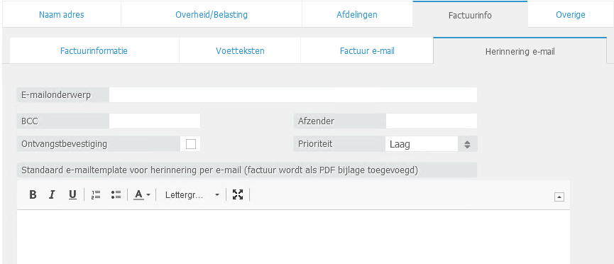 - E-mailonderwerp: Hier kunt u een standaard e-mailonderwerp voor uw aanmaningen instellen, eventueel met behulp van templatecodes.