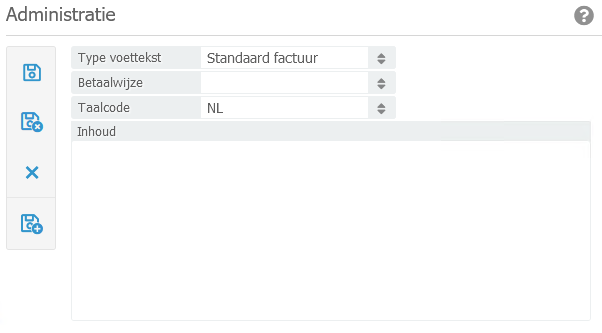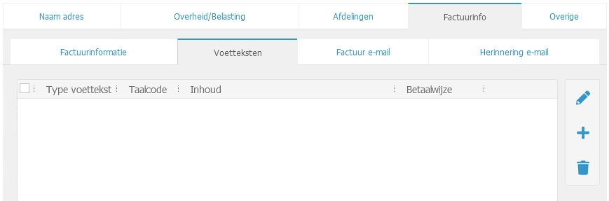 Hier kunt u de voetteksten invoeren die kunnen worden getoond in de factuurtemplate. Dit is wel afhankelijk van uw maatwerk template.