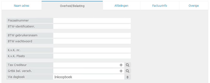 - Tax Crediteur: Indien u de btw aangiften wenst te verwerken, dient u hier de instantie van de belastingen te koppelen. Wellicht zal u deze relatie eerst nog dienen aan te maken.