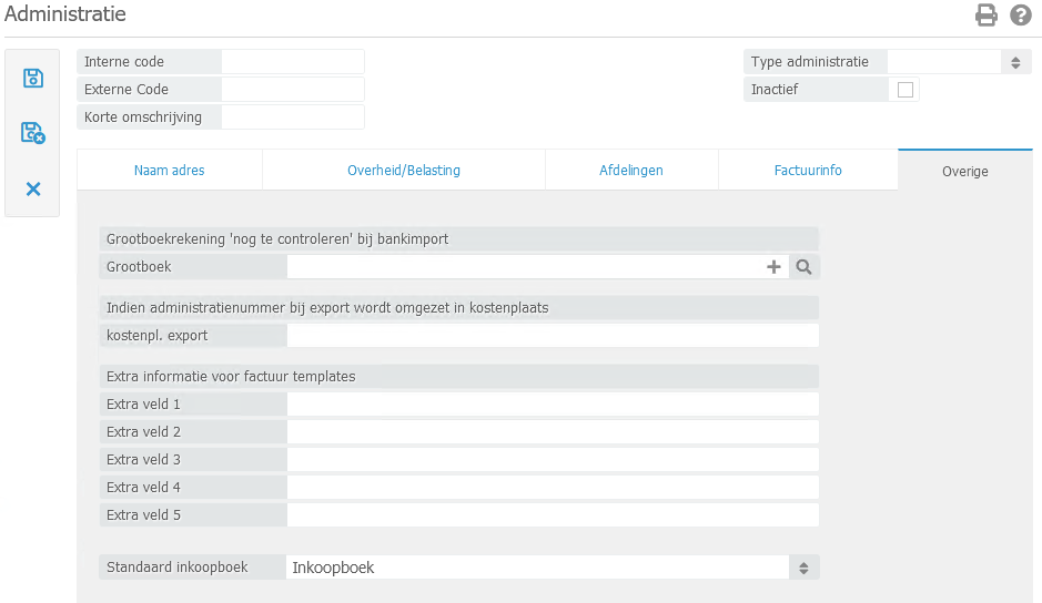 - Externe code: Wanneer u gebruik gaat maken met een exportkoppeling naar Twinfield of Exact Online dient u de administratiecodes van dat pakket in te voeren.
