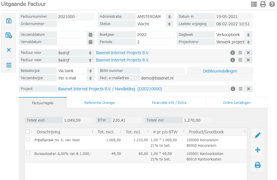 - Open de factuur door in de kolom “Factuur” te klikken op “Open factuur:…(factuurnummer). Onderstaand scherm zal worden geopend: