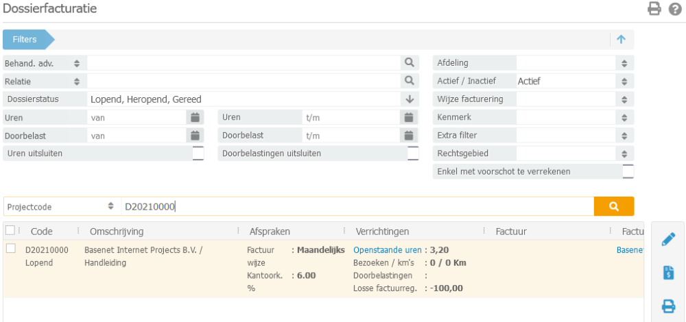 Het is mogelijk om in een dossier de factureerbare onderdelen te splitsen naar dezelfde factuurrelatie, zodat de facturen op dezelfde naam komen te staan. Dit kan handig zijn bij declaraties naar bijvoorbeeld de DAS en uw cliënt.