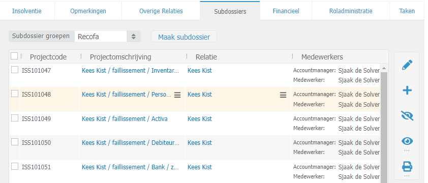 Tabblad ➤ Subdossiers Hier kunt u subdossiers toevoegen. Via Bedrijfsinstellingen ➤ Insolventie ➤ Standaard Subdossier kunt u eventueel een subdossier groep aanmaken. Het subdossier groep volgens de richtlijnen van Recofa is al opgenomen in ons systeem. Om deze toe te voegen selecteer dan Recofa in het veld Subdossier groepen en klik op Maak subdossier.