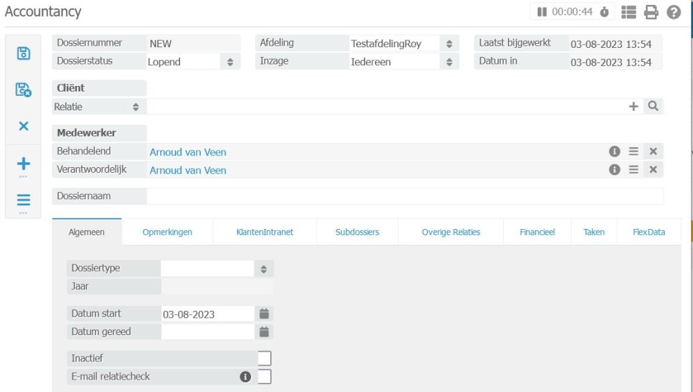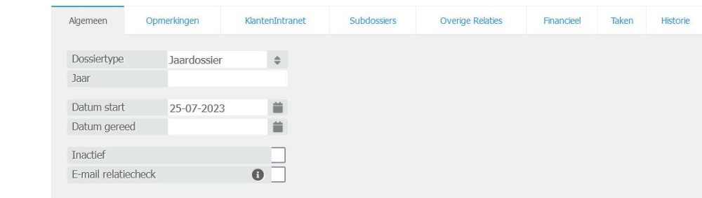 In het bovenste deel van het dossierscherm dient u de relaties in te voeren [een contactpersoon, bedrijf of particulier] en medewerkers [behandelend medewerker en verantwoordelijk medewerker]. Deze laatste twee zijn altijd medewerkers van het kantoor.