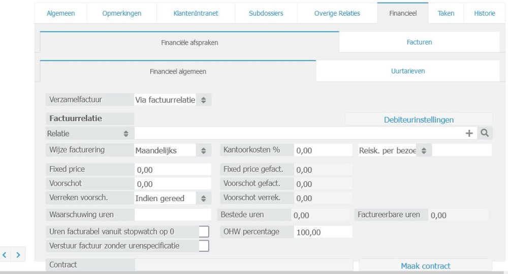 Fixed bedrag: Het bedrag dat ingevuld wordt in dit veld zal in rekening worden gebracht bij de facturatie. Er zullen geen uren in rekening gebracht worden. Doorbelastingen en eventuele kantoorkosten zullen wel in rekening worden gebracht.