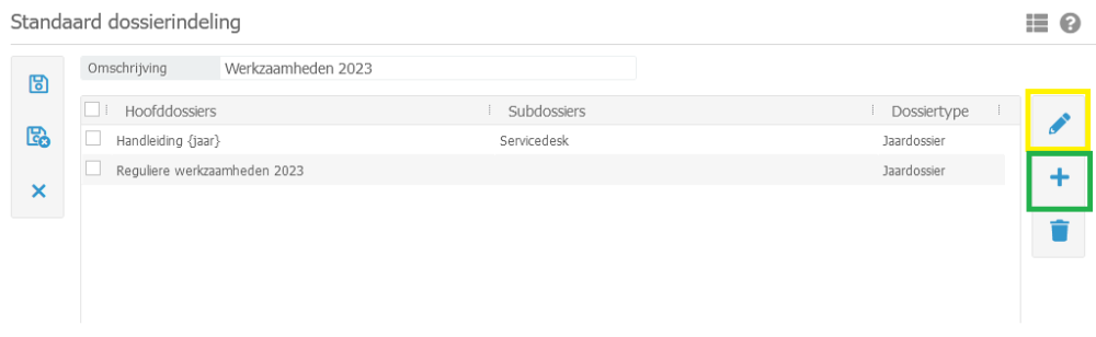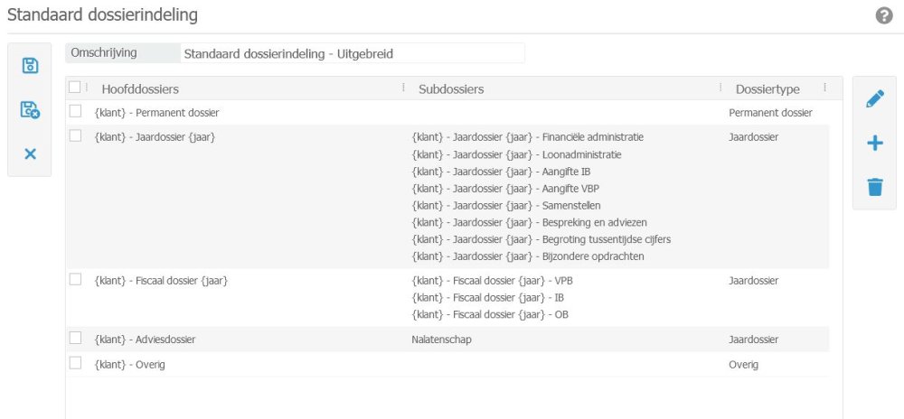 Via de Bedrijfsinstellingen > Accountancy > Standaard dossierindelingen zijn de templates in te zien en te beheren die gekozen kunnen worden bij aanmaak van een standaard dossierindeling.