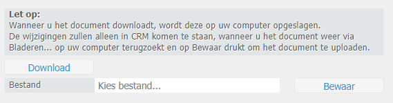 In het document scherm van BaseNet gaat u naar het tabblad Download/Upload. Klik op de knop Download. Het document wordt nu lokaal op PC geopend. Wanneer u deze bewerkt en opslaat zal het niet automatisch in BaseNet worden opgeslagen. In hetzelfde tabblad kunt u het bestand vanuit uw PC selecteren en uploaden. Het document dat al in BaseNet stond wordt door deze actie overschreven.