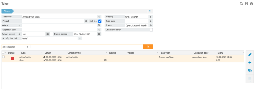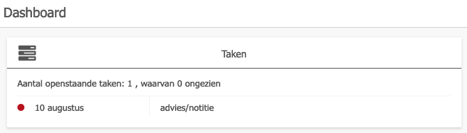 U kunt er voor kiezen om de taken widget te activeren om direct na het inloggen uw taken overzicht te zien. Dat doet u door in het dashboard de grijze plus rechts boven in te klikken en dan te kiezen voor taken. Er is ook een widget genaamd Taken voor collega’s, deze toont de taken die u klaar heeft gezet voor uw collega’s.