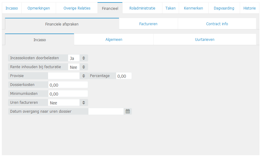 In dit scherm bestaat ook de mogelijkheid om van het incassodossier een urendossier te maken, waarbij de uren die geschreven zijn gefactureerd worden. Vaak is dit in het begin niet het geval, maar later in het proces wel. Wanneer het incassodossier over gaat naar een urendossier vult u hier met het pulldown menu ja en tevens de datum in.