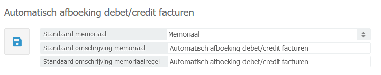 Via dit menu kunt u ingeven via welk memoriaal dagboek een debetfactuur en de bijbehorende creditfactuur automatisch worden afgeboekt in het geval van volledige crediteringen. Zodra u in de twee tekstvelden een waarde invoert (zie voorbeeld hieronder) en dit opslaat, is de automatische afboeking direct ingesteld en is dan van kracht op nieuwe creditfacturen.