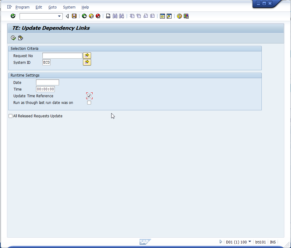 2. Run /BTI/TE_RLINKS_UPDATE_JOB_V2 in each of your development systems with the All released requests update checkbox set.