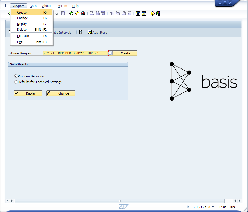 4. Within each of your development systems, define the program via transaction /n/BTR/MDR. Enter /BTI/TE_REP_MDR_OBJECT_LINK_V2 and press Create with the radio button Program Definition selected.