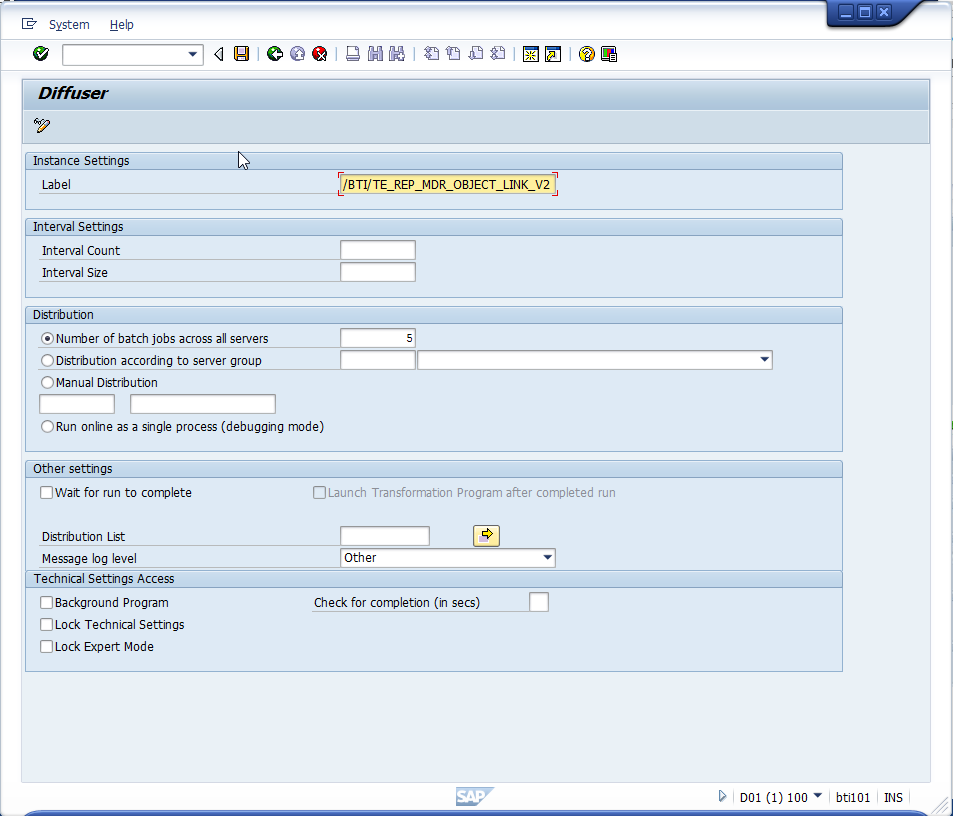 6. Within each of your development systems, set the technical settings for the same program via transaction /n/BTR/MDR. Enter /BTI/TE_REP_MDR_OBJECT_LINK_V2 as the program, select the radio button Defaults for Technical Settings and press the Change button.
