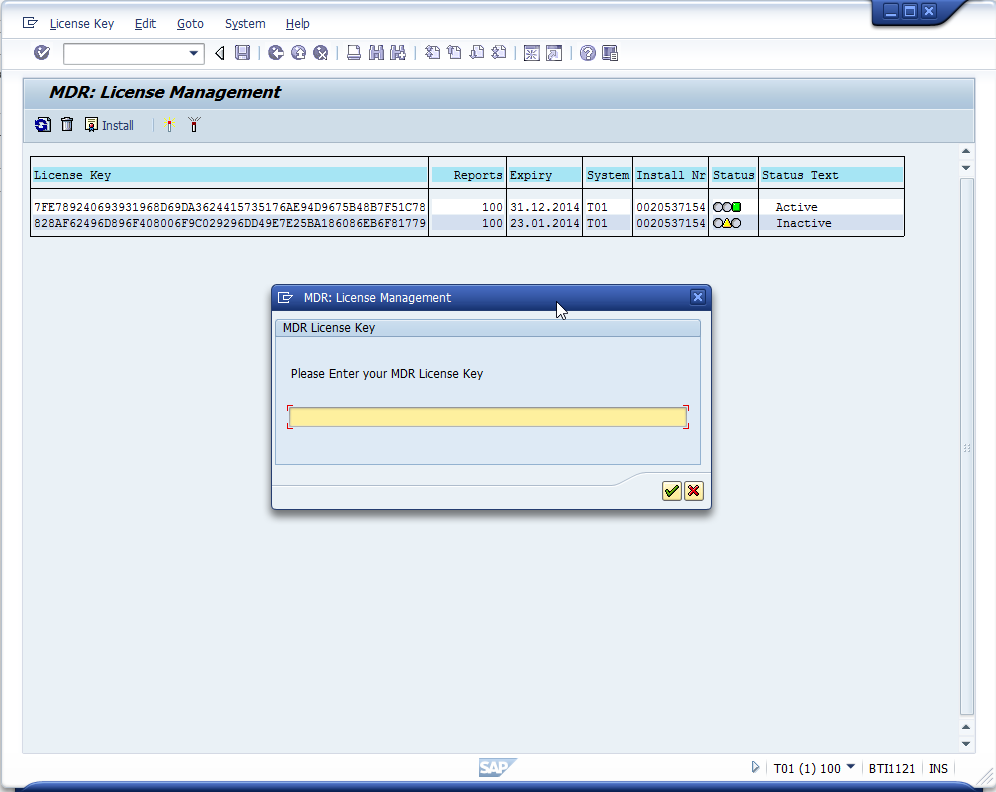 1. Within your Domain Controller, enter your MDR license key by executing transaction /N/BTR/MDRLICENSE, then select the option Install and a dialog appears into which you can enter the key.