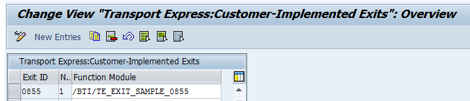 Use SAP transaction SE16 within TE table BTI/TE_EXITC – add an entry for user exit 0855
