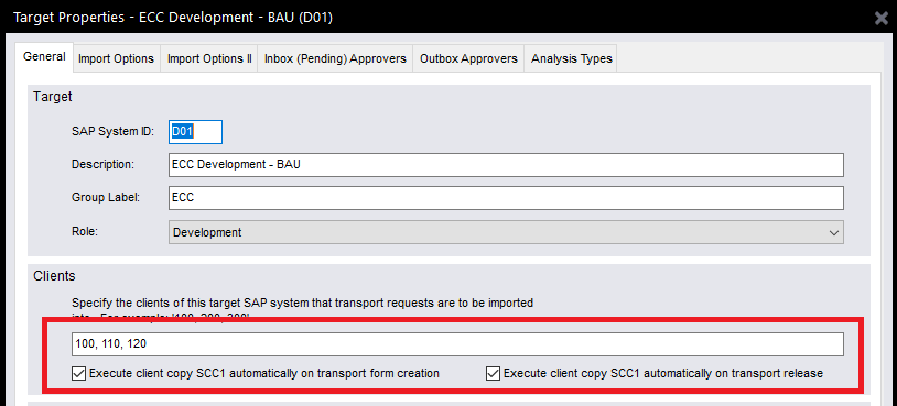 Note: If multiple clients are adding in the Development target, then client dependant transport forms will be put in the Development system Import Queue. To avoid this, TE Skipping can be used to skip all Transport Forms past that Import Queue if required.