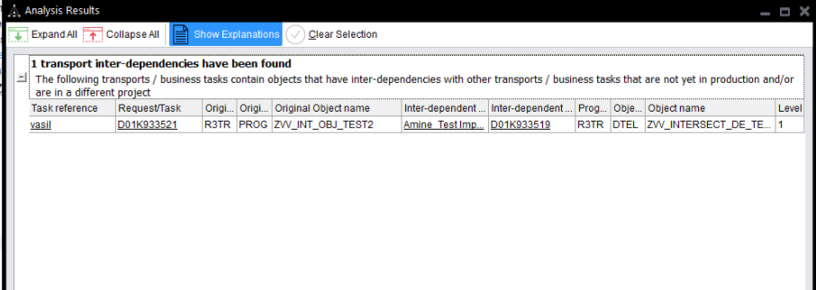 2. Checks to see if any of the exploded out objects are in transports in the path, in the same target as the transport being analysed or in front of the transport being analysed (i.e. not in production yet) – to provide an intersection of the transports/objects between the transport(s) being analysed and other transports in the path.