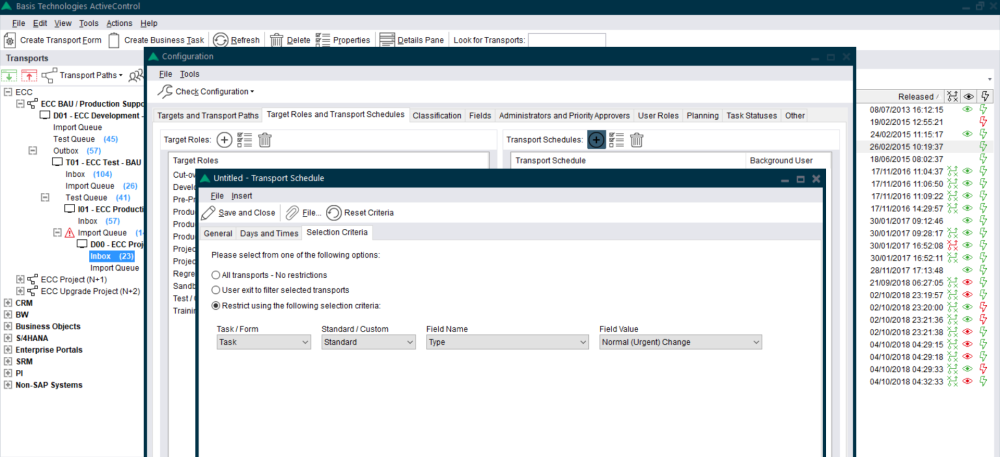 It is possible to create and assign multiple condition-based Import Schedules to a target system. This can be helpful in scenarios where you want to deploy different types of transport/change to different release frequencies, for example if you want Emergency Fixes to be imported as soon as they are ready, but other Business Task ‘Types’ to be deployed as part of a less frequent release cycle.