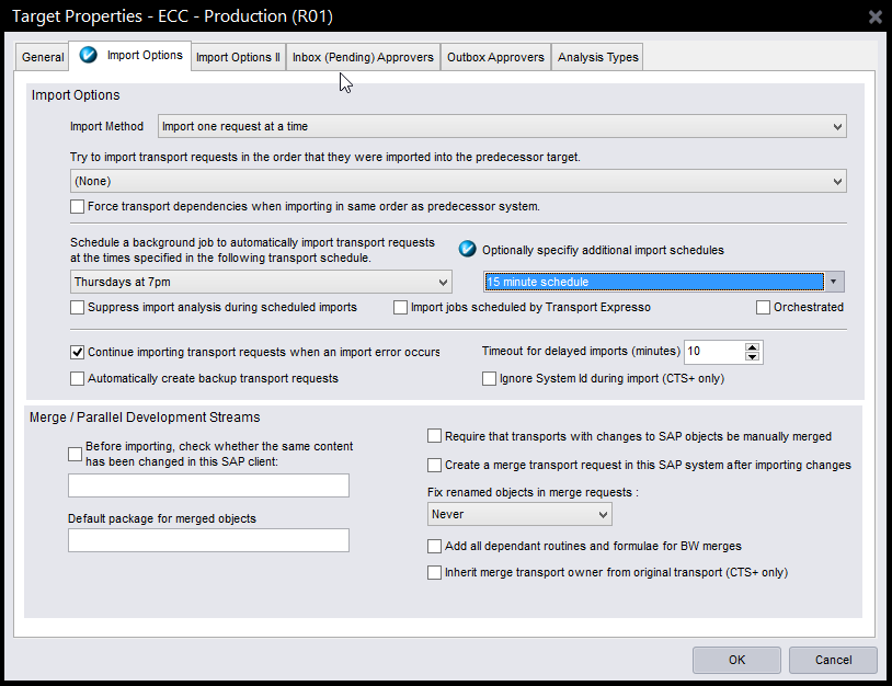 The addition of additional schedules to SAP systems is done within the *Import Options” tab of an individual Target within the Windows GUI. It can also be done in the Advanced Import Options menu whilst on the main Windows GUI screen (on an Import Queue).