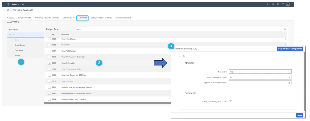 The Administrators should #1 select the control point location in which to configure Analyser, #2 activate the Analyser via checkbox and then #3 switch on the necessary attributes and parameters.