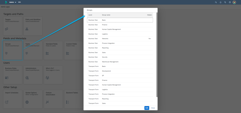 Groups are used to group Transport Forms and Business Tasks into appropriate collections. Typically, groups are used to classify the transport request or task by functional area or team. For example, groups can be used to differentiate Finance changes from Procurement changes.