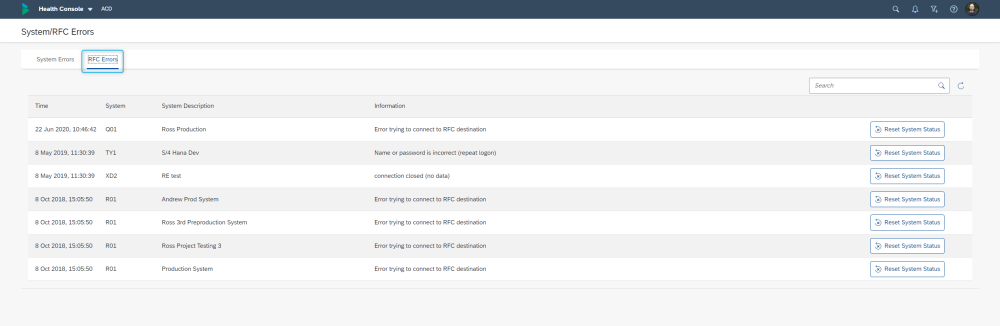 RFCs Errors (ie connectivity issues between the Domain Controller out to the managed satellite systems) can also be viewed via the Health Console.