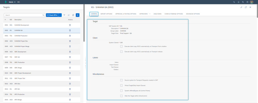 | Virtual Target | Virtual targets can be used to facilitate additional Approvals (Inboxes, Test Queues, Outboxes) as part of a complex workflow. A Virtual Target has no import queue; Transport Forms moving past that Virtual Target import queue will show as “Mark as Imported” for that location. The Virtual Target can be given the same SID as the Target in which you want the additional approval point(s) – or it can be given a dummy SID to easily identify that particular approval point(s). If the target system is unavailable or is a virtual target system use this option to skip the Import Queue, but still stop in the other control points for approvals. |