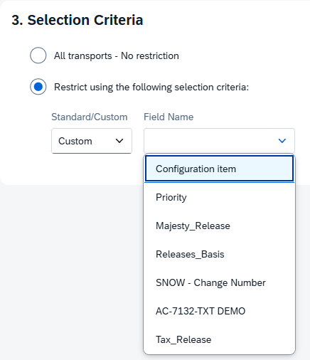Condition-based Schedules can be configured within the Selection Criteria section of the Release Schedule creation process. Conditions can be created based on both standard and custom fields at release form Level.