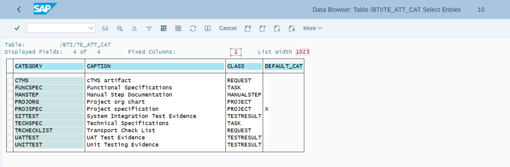 Defaults can be specified via the DEFAULT_CAT field in /BTI/TE_ATT_CAT table, by entering an “X” against the row that you want to be defaulted.